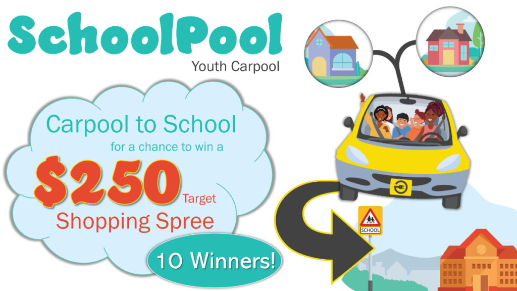 Buddy up this year to save gas, reduce school zone traffic, and improve classroom air quality. School carpools are fun for students and save time for parents. Families who carpool with friends and neighbors can sign up for 511 Contra Costa’s free SchoolPool program for a chance to win one of ten $250 back-to-school shopping sprees at Target.